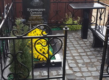 Покрасить ограду, так как чаще всего при установке ограды красят транспортировочной краской, которая приходит в негодность через год. Облицевать бетонный цоколь и бетон обрамляющий цветник. В данном случае для этого мы использовали керамогранит. Установили гранитные лавочку и столик. Посадили две туи и кустовые хризантемы в цветник. Заменили пластиковую вазу на гранитную. Уложили гранитную брусчатку на пол.